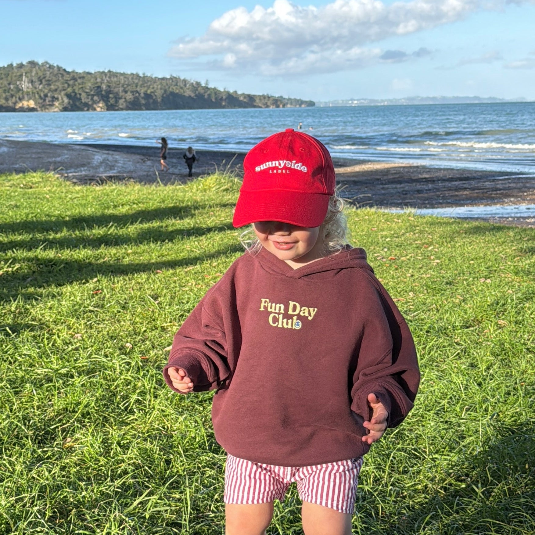 Our hot Inferno cap is finished off with a clean white embroidered Sunnyside logo on the front panel and sun emblem tag by the back strap.