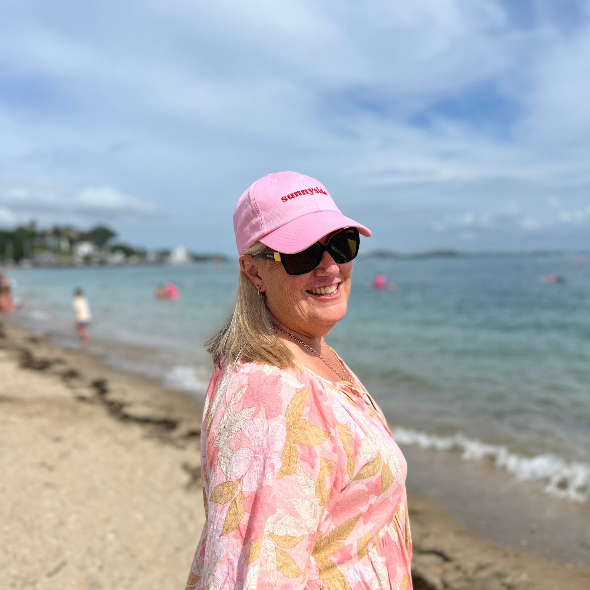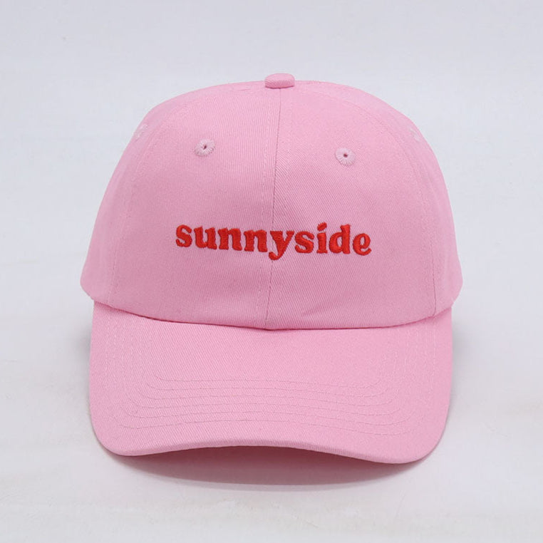 Our sweet Strawberry cap is finished off with a bright red embroidered Sunnyside logo on the front panel and sun emblem tag by the back strap.