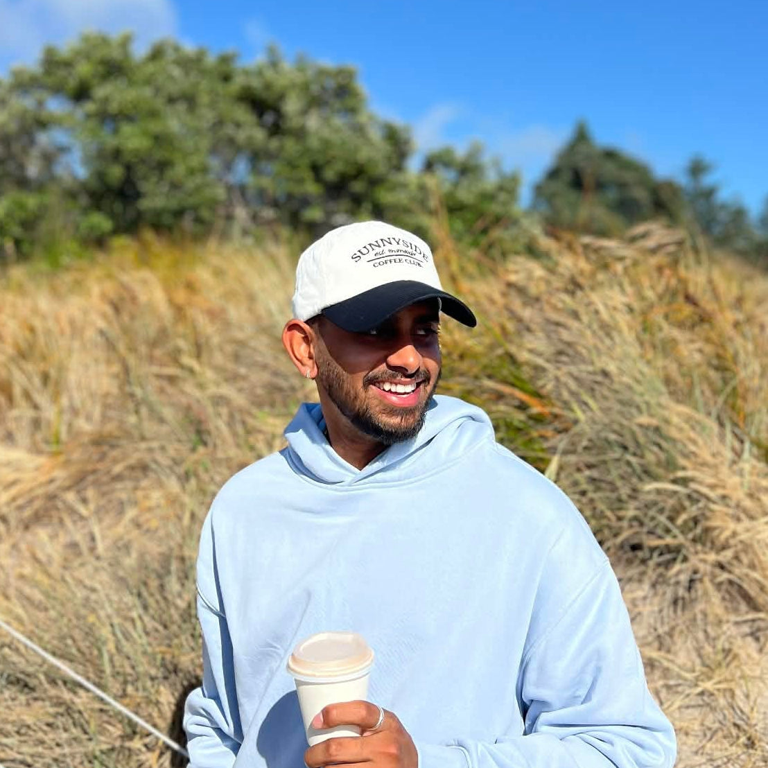 Our Long Black cap offers a two tone vibe. A crisp white cap base with a black visor. Finished off with a black embroidered Sunnyside Coffee Club logo on the front panel and sun emblem tag by the back strap.